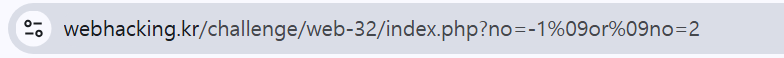 - ์ต์ข ์ ์ผ๋ก, ์ด no=-1%09or%09no=2 ๊ฐ์ url์ ์ ๋ ฅํด ์ฃผ๋ ๋ฌธ์ ๋ฅผ ํด๊ฒฐํ ์ ์์๋ค.